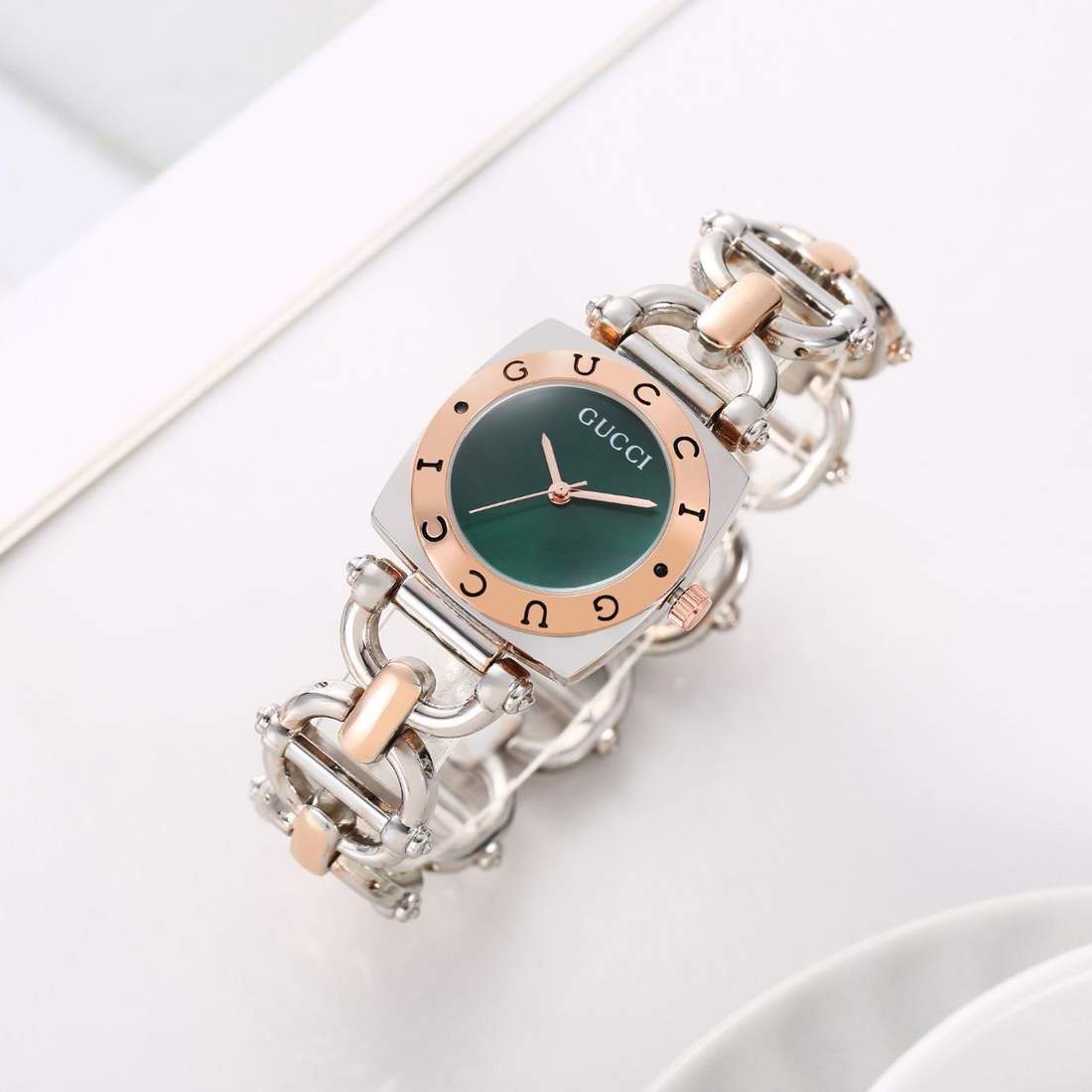 Elegant Gucci women’s wristwatch featuring a polished silver-tone bracelet with signature horsebit-style links. The watch has a mother-of-pearl dial, minimalist hands, and a square bezel engraved with the GUCCI logo.