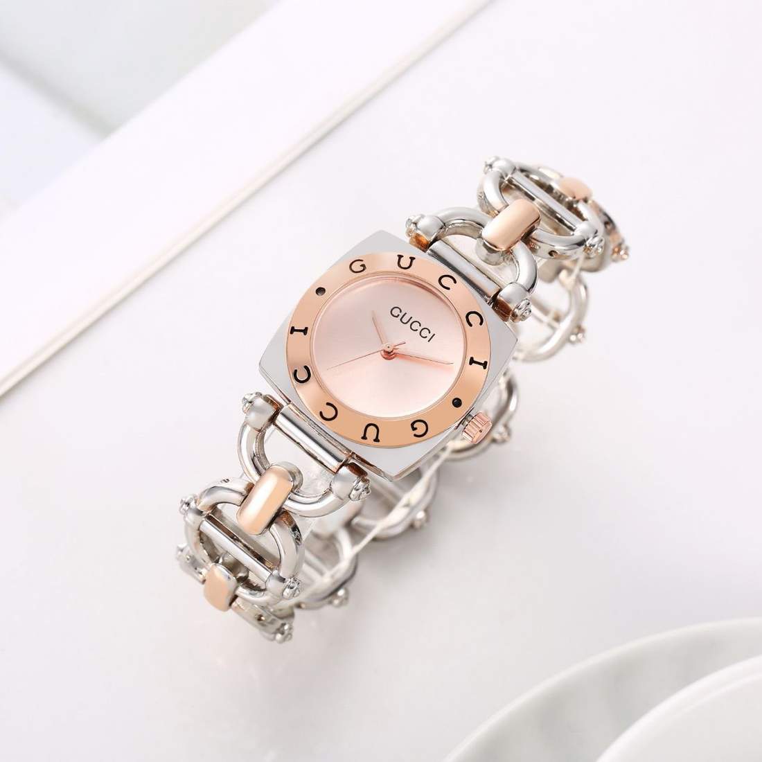 Elegant Gucci women’s wristwatch featuring a polished silver-tone bracelet with signature horsebit-style links. The watch has a mother-of-pearl dial, minimalist hands, and a square bezel engraved with the GUCCI logo.